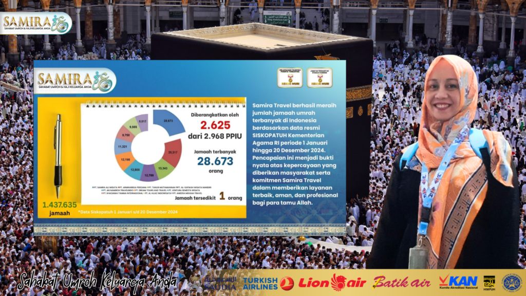 Sejak 2021 sampai Mei 2025 alhamdulillah samira travel menjadi travel dengan jamaah terbanyak di Indonesia. Pencapaian ini menandakan samira travel adalah travel umroh yang amanah dan bisa dipercaya untuk mewujudkan impian anda menjalankan ibadah umroh yang mabrur. Selama 2024 Samira Travel tercatat memberangkatkan 28.673 Jamaah.